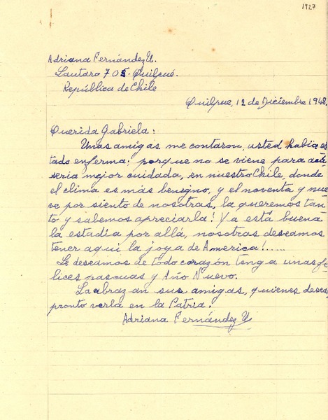 [Carta] 1948 dic. 12, Quilpué, Chile [a] Gabriela Mistral [manuscrito] Adriana Fernández.