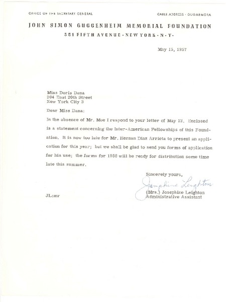 [Carta] 1957 may. 15, New York [a] Doris Dana, New York [manuscrito] Josephine Leighton.