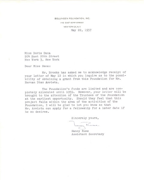 [Carta] 1957 may. 22, New York [a] Doris Dana, New York [manuscrito] Nancy Russ.