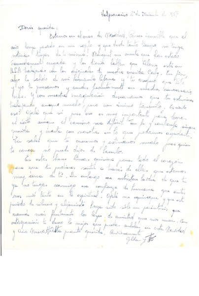 [Carta] 1957 dic. 1, Valparaíso, Chile [a] Doris Dana, [New York] [manuscrito] Gilda Péndola Gianollo.