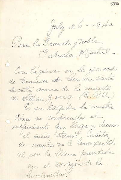 [Carta] 1942 jul. 26, Evanston, Illinois [a] Gabriela Mistral [manuscrito] Fresia Brenes de Hilarov.