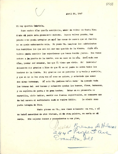 [Carta] 1947 abr. 29, Evanston, Illinois [a] Gabriela Mistral [manuscrito] Fresia Brenes de Hilarov.