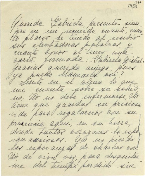 [Carta] 1950 [Santiago] [a] Gabriela Mistral [manuscrito] Aleda del Monte.