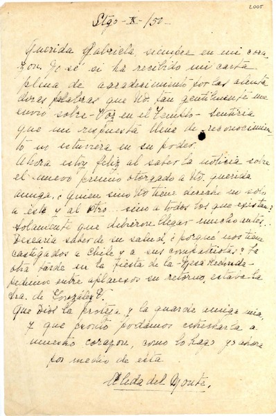 [Carta] 1950 oct., Santiago [a] Gabriela Mistral [manuscrito] Aleda del Monte.