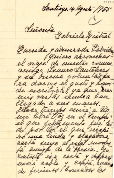 [Carta] 1955 ago. 14, Santiago, [Chile] [a] Gabriela Mistral [manuscrito] Aleda del Monte.