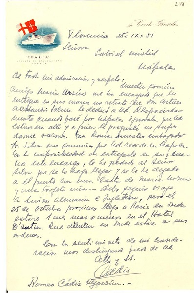 [Carta] 1951 sept. 23, Roma [a] Gabriela Mistral [manuscrito]Romeo Cádiz Oyarzún.