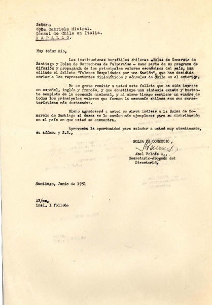 [Carta] 1951 jun., Santiago, [Chile] [a] Gabriela Mistral, Rapallo, [Italia] [manuscrito] Abél Valdés A.