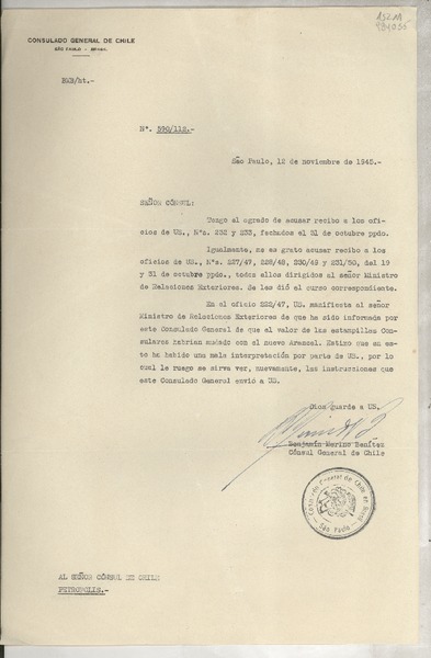 [Oficio] N° 590112, 1945 nov. 12, São Paulo, Brasil [al] Señor Cónsul de Chile, Petrópolis, [Brasil] [manuscrito] / Benjamín Merino Benítez Cónsul General de Chile.