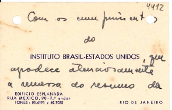 [Tarjeta] 1943 nov. 20, Río de Janeiro [a] Gabriela Mistral [manuscrito] Instituto Brasil-Estados Unidos.