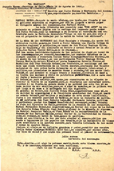[Carta] 1952 ago. 16, Santiago, Chile [a] Gabriela [Mistral] [manuscrito] Julio Serena, Hortensia del Aconcagua.