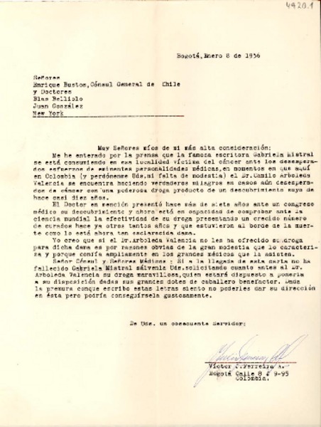 [Carta] 1956 ene. 8, Bogotá, Colombia [a] Enrique Bustos y doctores Juan Belliolo y Juan González, New York [manuscrito] Víctor Ferreira.