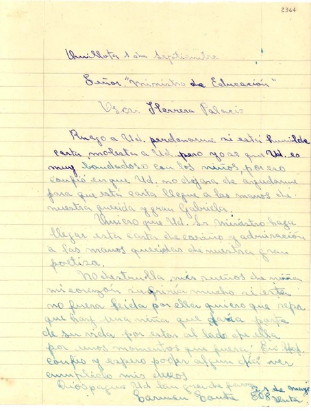 [Carta] 1954 sept. 1, Quillota [a] Gabriela Mistral [manuscrito] Carmen Conte Bórquez.