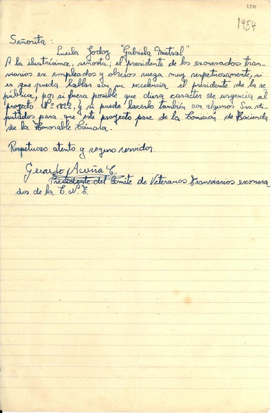 [Carta] 1954 sept, Santiago [a] Gabriela Mistral [manuscrito] Gerardo Acuña C.