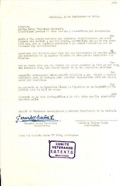 [Carta] 1954 sept. 12, Santiago [a] Gabriela Mistral