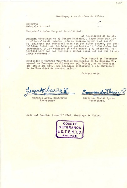 [Carta] 1954 oct. 4, Santiago, Chile [a] Gabriela Mistral [manuscrito] Gerardo Acuña Contreras, Servando Ibáñez Opazo.