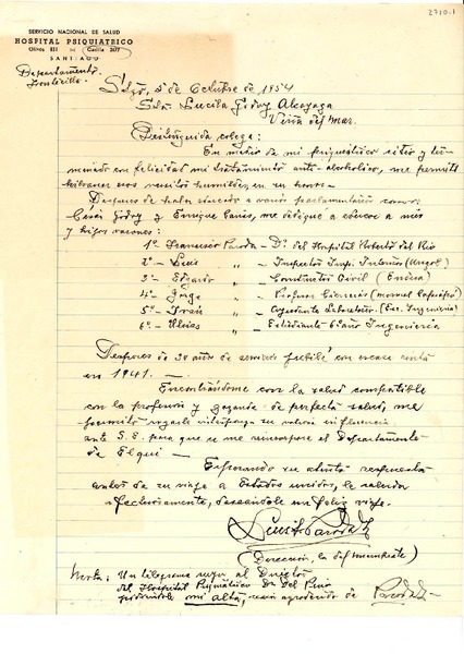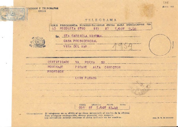 [Carta] 1954 oct. 5, Santiago [a] Lucila Godoy, Viña del Mar [manuscrito] Luis Parada.