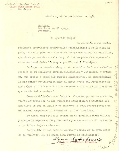 [Carta] 1953 ago. 8, Antofagasta, Chile [a] Joaquín Edwards Bello [manuscrito] Alejandro Escobar Carvallo.