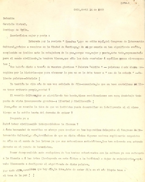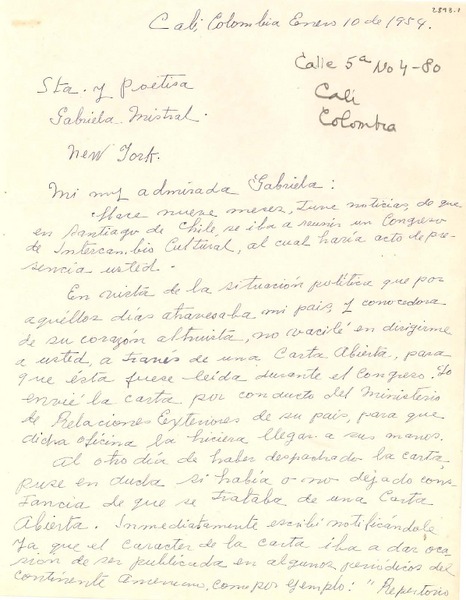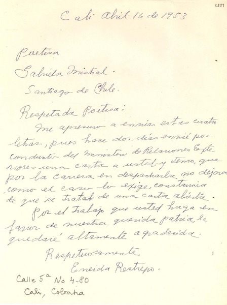 [Carta] 1953 abr. 16, Cali, [Colombia] [a] Gabriela Mistral, Santiago, Chile [manuscrito] Eneida Restrepo.