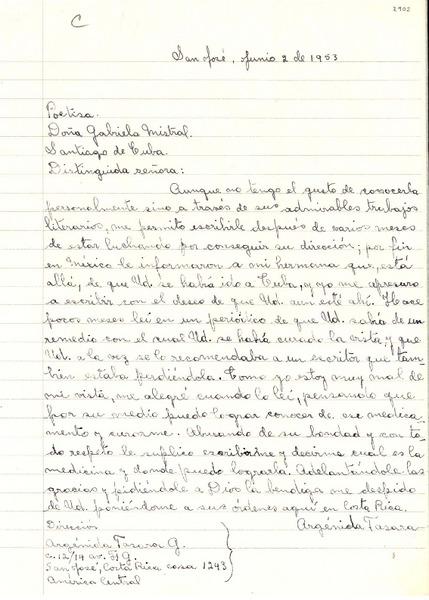 [Carta] 1953 jun. 2, San José, Costa Rica [a] Gabriela Mistral, Santiago de Cuba [manuscrito] Argénida Tasara G.
