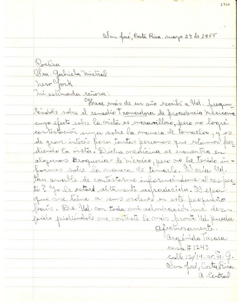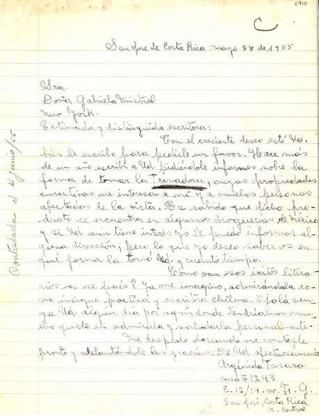 Mistral, Gabriela - Manuscritos costarricenses - Tasara G., Argénida - Correspondencia
