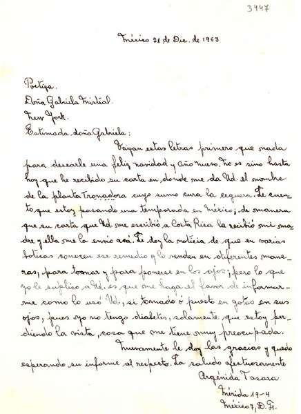 [Carta] 1953 dic. 21, México [a] Gabriela Mistral, New York [manuscrito] Argénida Tasara G.