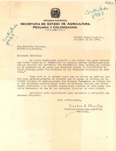 Mistral, Gabriela - Correspondencia - Manuscritos puertorriqueños - Autores puertorriqueños - Chardón, Carlos E.