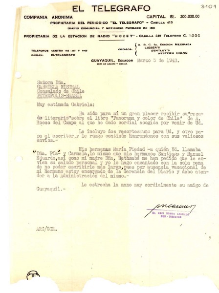 [Carta] 1943 mar. 5, Guayaquil, Ecuador [a] Gabriela Mistral, Consulado de Chile, Petrópolis, Brasil [manuscrito] Abel Romeo Castillo.
