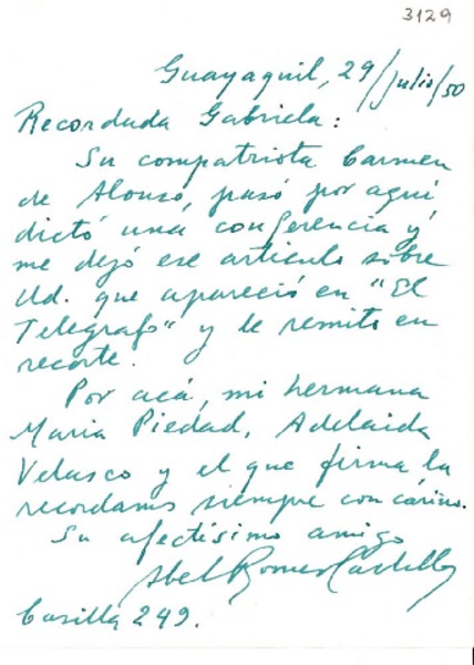 [Carta] 1950 jul. 29, Guayaquil, [Ecuador] [a] Gabriela Mistral [manuscrito] Abel Romeo Castillo.
