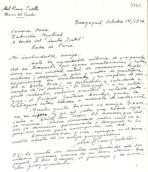 [Carta] 1954 oct. 14, Guayaquil, Ecuador [a] Gabriela Mistral, a bordo del "Santa Isabel", Rada de Puná [manuscrito] Abel Romeo Castillo.