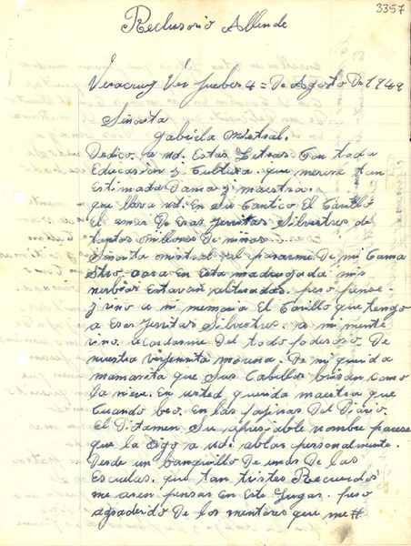 [Carta] 1949 ago. 4, Veracruz [a] Gabriela Mistral [manuscrito] Fernando Gálvez Salas.