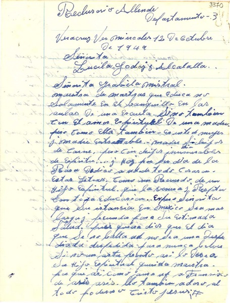 [Carta] 1949 oct. 12, Veracruz [a] Gabriela Mistral [manuscrito] Fernando Gálvez Salas.