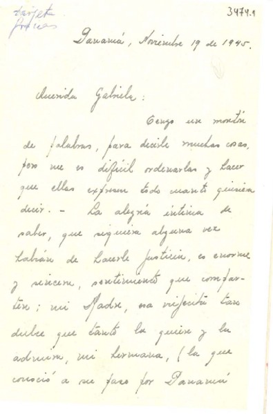 [Carta] 1945 nov. 19, Panamá [a] Gabriela [Mistral] [manuscrito] [Rebeca Minutto de Rosypal].