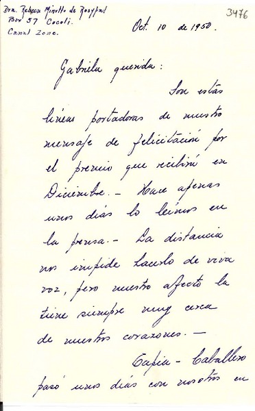 [Carta] 1950 oct. 10, Canal Zone, [Panamá] [a] Gabriela [Mistral] [manuscrito] [Rebeca Minutto de Rosypal].
