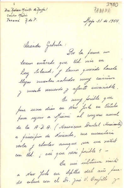[Carta] 1954 ago. 28, Panamá [a] Gabriela Mistral, Callao [manuscrito] Dra Rebeca Minutto de Rosypal.