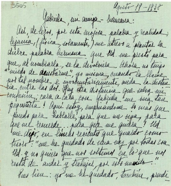 [Carta] 1938 ago. 19, Lima [a] Gabriela Mistral [manuscrito] Catalina Recabarren de Zizold.