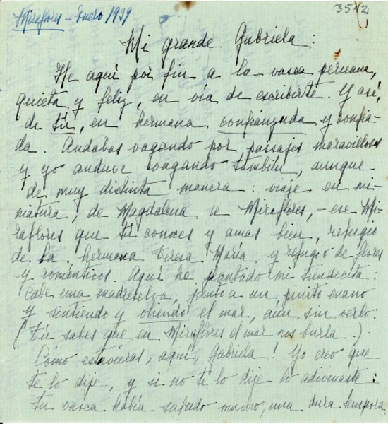 [Carta] 1939 ene., Miraflores, [Perú] [a] Gabriela Mistral [manuscrito] Catalina Recavarren.