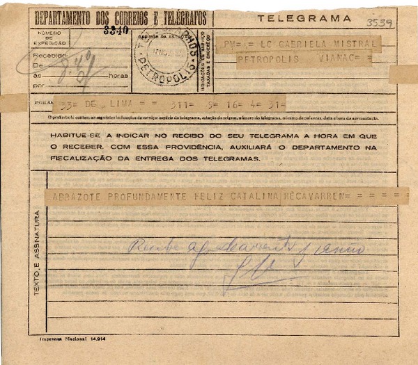 Mistral, Gabriela - Correspondencia - Autoras peruanas - Manuscritos peruanos - Recavarren de Zizold, Catalina