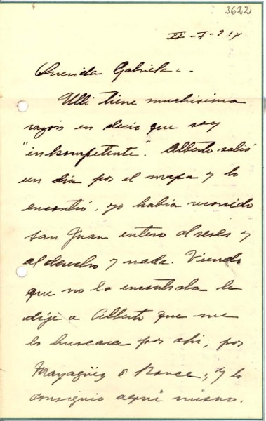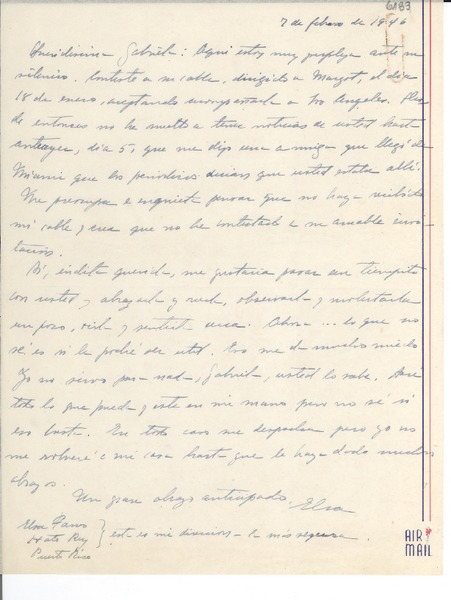 [Carta] 1946 feb. 7, Puerto Rico [a] Gabriela Mistral [manuscrito] Elsa [Fano].