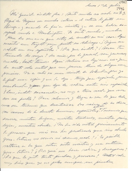 [Carta] 1946 jul. 1, Puerto Rico [a] Gabriela Mistral [manuscrito] Elsa Fano.