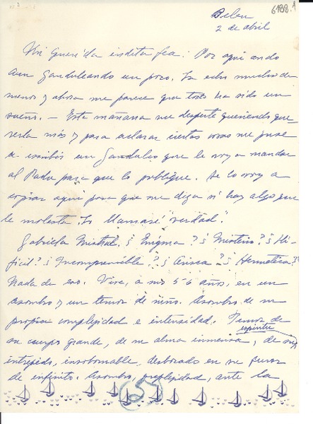 [Carta] 1947 abr. 2, Bethlehem, Pennsylvania [a] Gabriela Mistral [manuscrito] Elsa Fano.