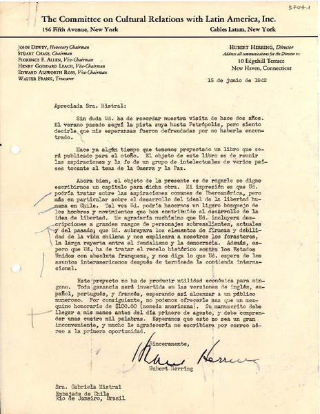 [Carta] 1942 jun. 15, New Heaven, Connecticut [a] Gabriela Mistral [manuscrito] Hubert Herring.