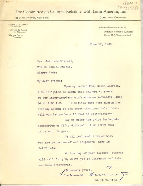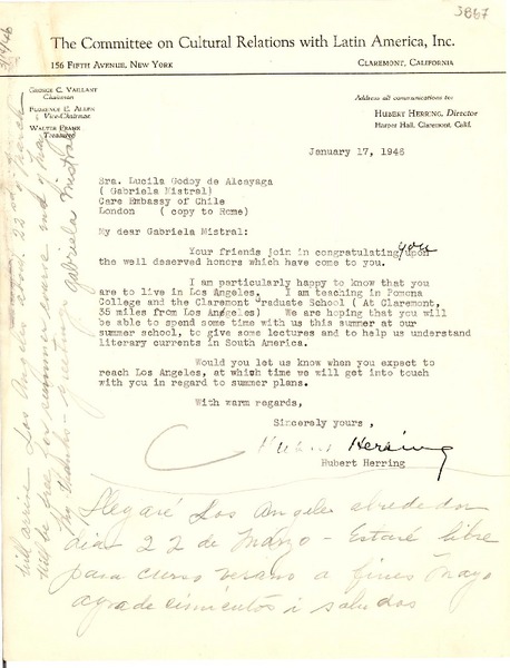[Carta] 1946 ene. 17, Claremont, California [a] Gabriela Mistral, Londres [manuscrito] Hubert Herring.