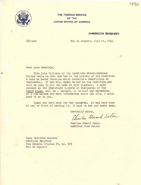 [Carta] 1944 jul. 11, Río de Janeiro [a] Gabriela Mistral, Río de Janeiro [manuscrito] Charles Edward Eaton.