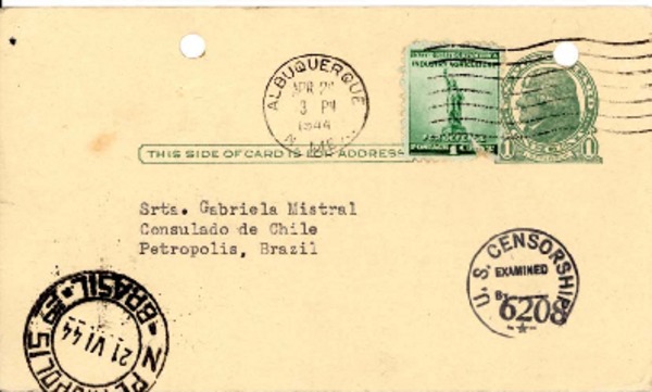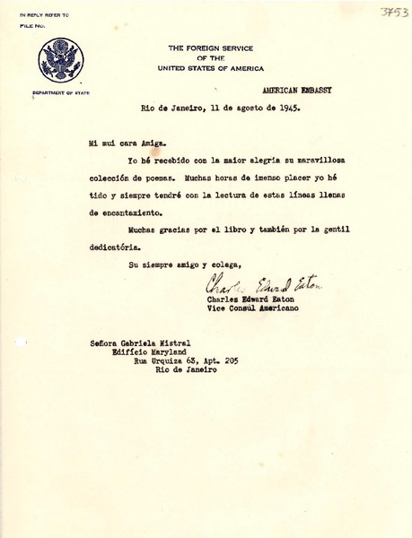 [Carta] 1945 ago. 11, Río de Janeiro [a] Gabriela Mistral, Río de Janeiro [manuscrito] Charles Edward Eaton.