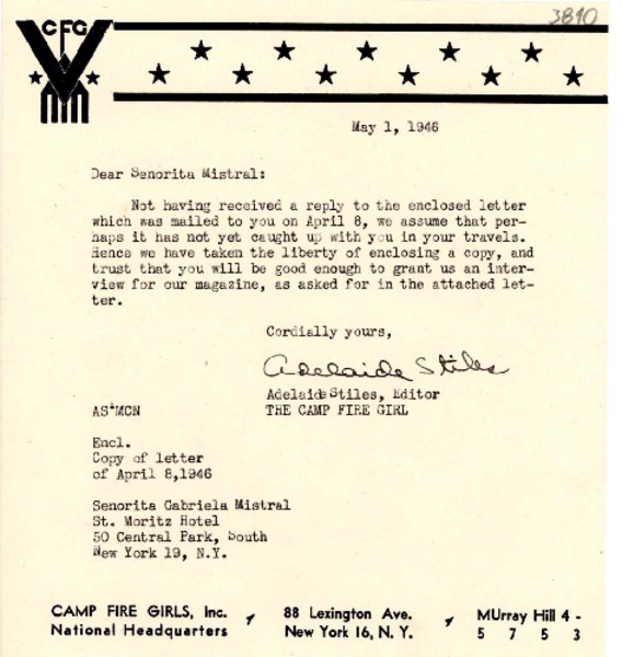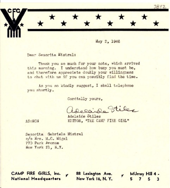 [Carta] 1946 abr. 8, N. York, [EE.UU.] [a] Gabriela Mistral [manuscrito] Adelaide Stiles.