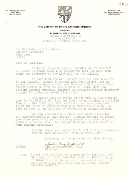 [Carta] 1951 ene, Webster Groves, Missouri [a] Gabriela Mistral, Veracruz, México [manuscrito] Sister Mary Joseph, S. L.