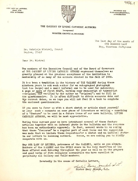 [Carta] 1951 mayo 31, Webster Groves, Missouri [a] Gabriela Mistral, Nápoles [manuscrito] Sister Mary Joseph, S. L.