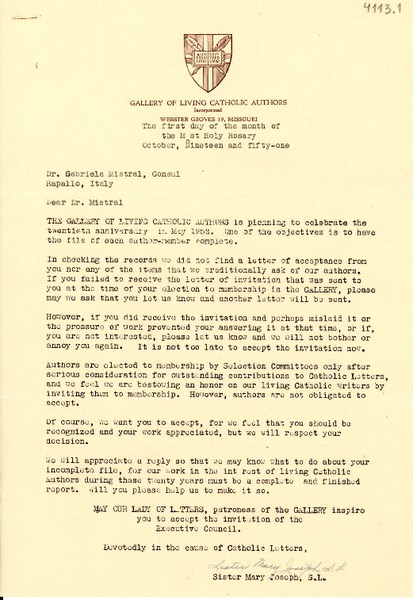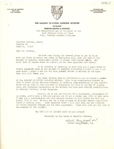 [Carta] 1951 jul. 23, Webster Groves, Missouri [a] Gabriela Mistral, Rapallo, Italia [manuscrito] Sister Mary Joseph, S. L.
