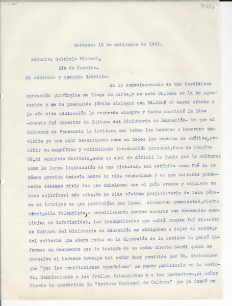 [Carta] 1941 sept. 13, Caracas, [Venezuela] [a] Gabriela Mistral, Río de Janeiro, [Brasil] [manuscrito] Mariano Picón-Salas.