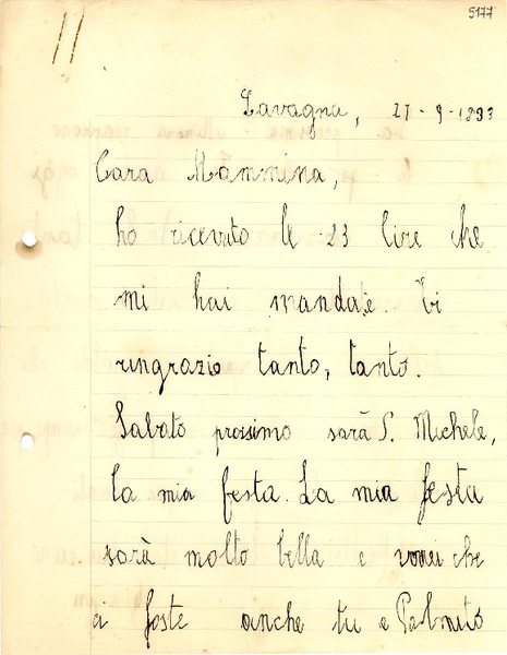 [Carta] 1933 sept. 27, Lavagna, [Italia] [a] Gabriela Mistral [manuscrito] Gin Gin.